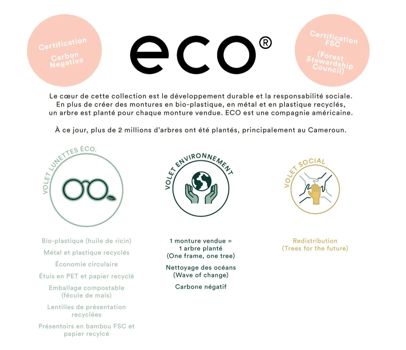 Monture de forme arrondie. Couleur bleue minuit lustré. Avec clip magnétique polarisé. Les lunettes ECO en bio-acétate (Biobased) sont faites de matériaux durables de source biologique ; soit à 63% d'huile non alimentaire renouvelable (l’huile de graines de ricin principalement) certifiée par l'USDA. Chaque monture de la collection ECO de MODOeyewear participe à reboiser les forêts du Cameroun.
